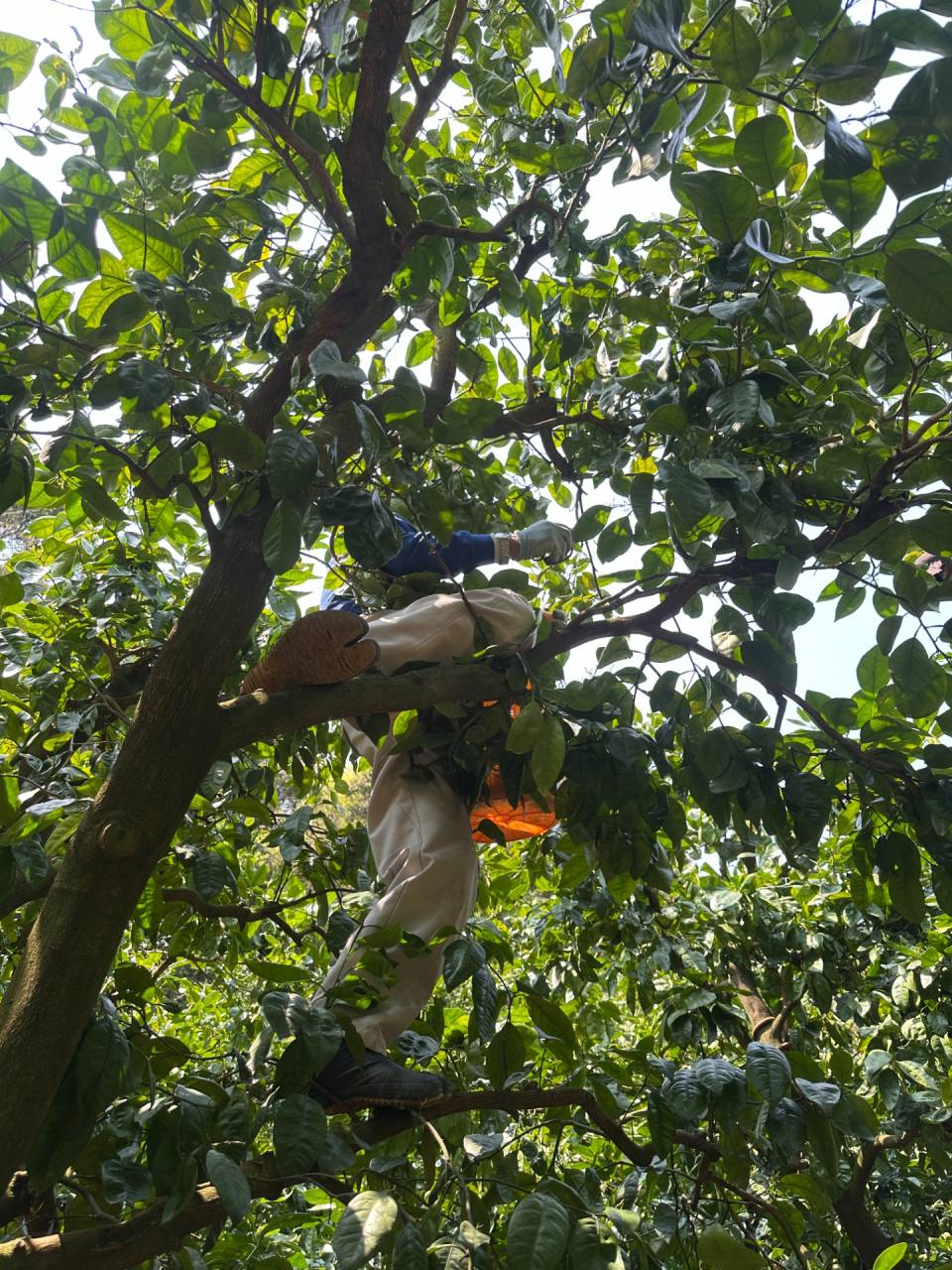 木の上の方に成っている果実は木に登って収穫します。